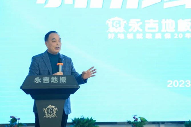 會議伊始,永吉地板創始人胡志慶首先致歡迎詞。他對參會的經銷商伙伴們表示誠摯的感謝和熱烈的歡迎。從永吉地板的品牌定位、行業趨勢、營銷策略、資源整合及2023年的發展規劃等多方面進行重要講話,鼓勵在場的經銷商們勇于開拓,爭取在業績上取得質的突破。