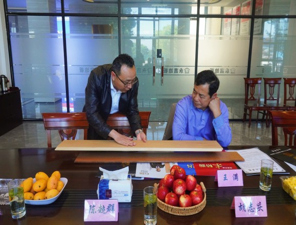 生產總監陳超群將公司的生產工藝、環保產品等進行了詳細介紹,并重磅介紹了兩款公司產品,木精髓和G28,決心開啟5.0不做油漆的健康環保地板時代。王會長對此首先表示祝賀和肯定,并鼓勵永吉木業不斷提高產品的創新,爭創佳績,努力為中國林產工業行業作出更大的貢獻。