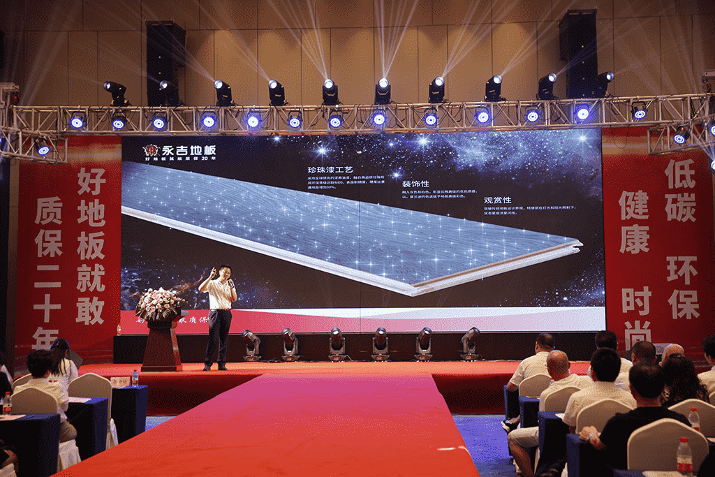發布會在科技感滿滿的燈光秀和激光舞中拉開帷幕,隨后播放的企業專題片,更是讓與會人員感受到永吉地板強大的實力和拼搏、創新、高效、誠信的精神。